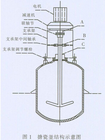 (4)設(shè)備整體找正找平。因?yàn)閷?shí)際上密封的安 裝基準(zhǔn)面是釜?dú)んw,而攪拌的安裝基準(zhǔn)面既有釜 殼體還有支架。就是說(shuō)在整體安裝后,既要保證攪 拌和釜體的垂直對(duì)中,又要保證攪拌和密封的同 軸度,即從電機(jī)輸出軸端(聯(lián)軸節(jié)處)點(diǎn)A,到中間 支承軸承點(diǎn)B,再到密封中心點(diǎn)C,三點(diǎn)ABC為一 直線(xiàn)且垂直于水平面。參見(jiàn)圖1。
